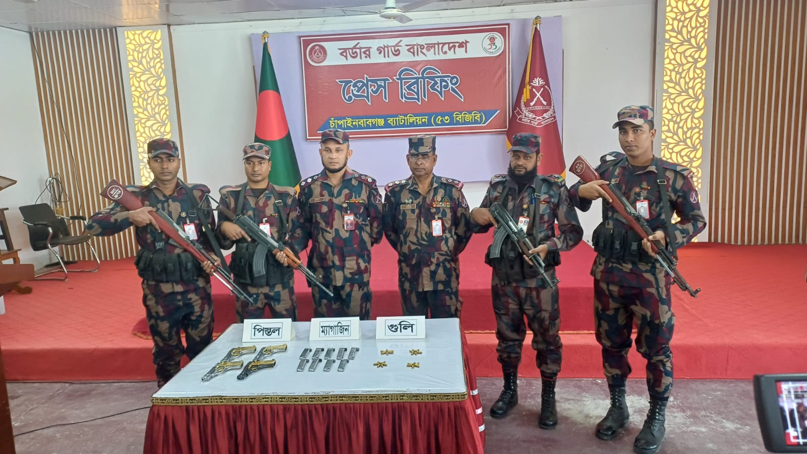 চাঁপাইনবাবগঞ্জ ব্যাটালিয়ন (৫৩ বিজিবি) এর অধিনায়ক লেফটেন্যান্ট কর্নেল কাজী মুস্তাফিজুর রহমান দুপুর দেড়টায় সাংবাদিকদের সাথে প্রেস কনফারেন্সে, জানায়, গত ১২ ডিসেম্বর ইনকিলাব মঞ্চের মুখপাত্র শরীফ ওসমান হাদীকে গুলি করার ঘটনার পর সীমান্ত ও অভ্যন্তরীণ এলাকায় বিশেষ টহল, চেকপোস্ট স্থাপন এবং গোয়েন্দা নজরদারি জোরদার করা হয়। এ সময় চাঁপাইনবাবগঞ্জ সীমান্ত দিয়ে অবৈধভাবে অস্ত্র প্রবেশের পরিকল্পনার তথ্য পাওয়া যায়।